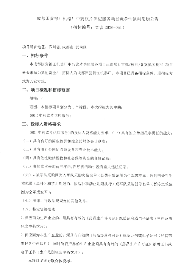 【成都国营锦江机器厂】四川省成都国营锦江机器厂中药饮片供应服务项目竞争性谈判采购公告