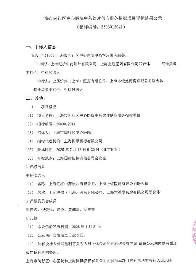 【上海市闵行区中心医院】上海市闵行区中心医院中药饮片供应服务招标项目评标结果公示
