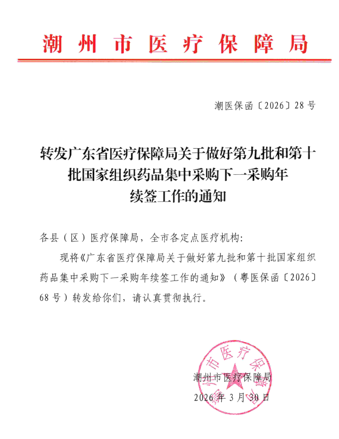 【潮州】转发广东省医疗保障局关于做好第九批和第十批国家组织药品集中采购下一采购年续签工作的通知