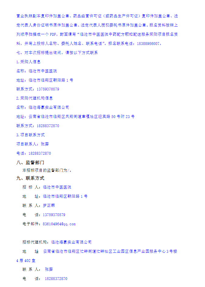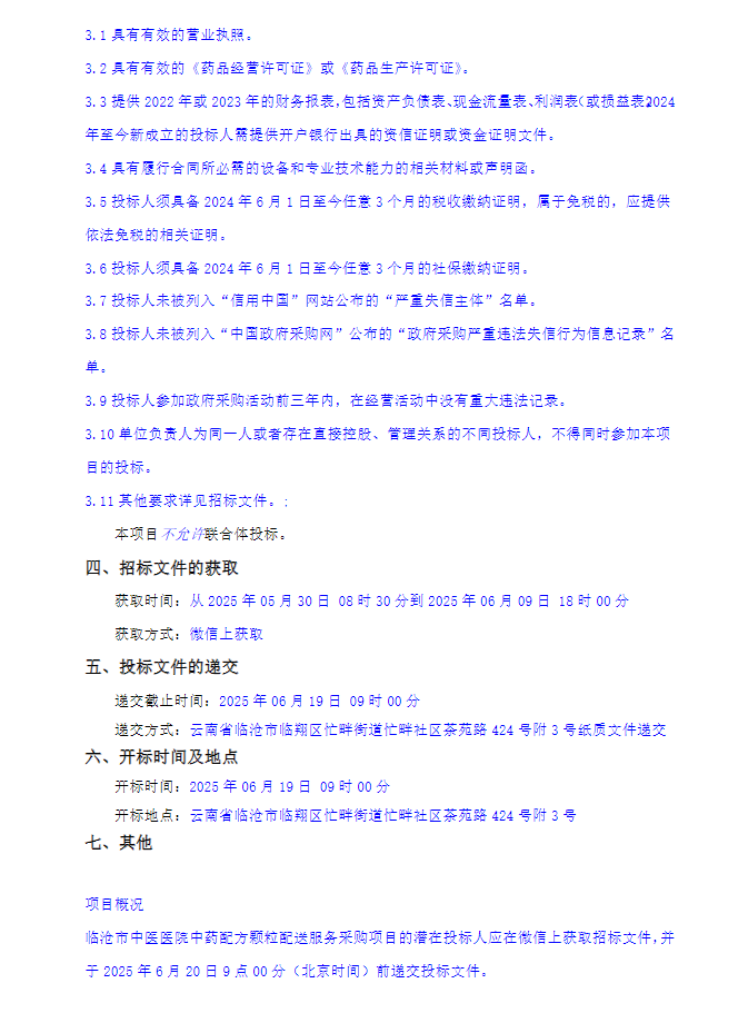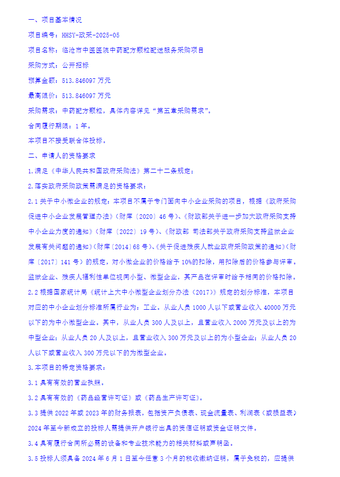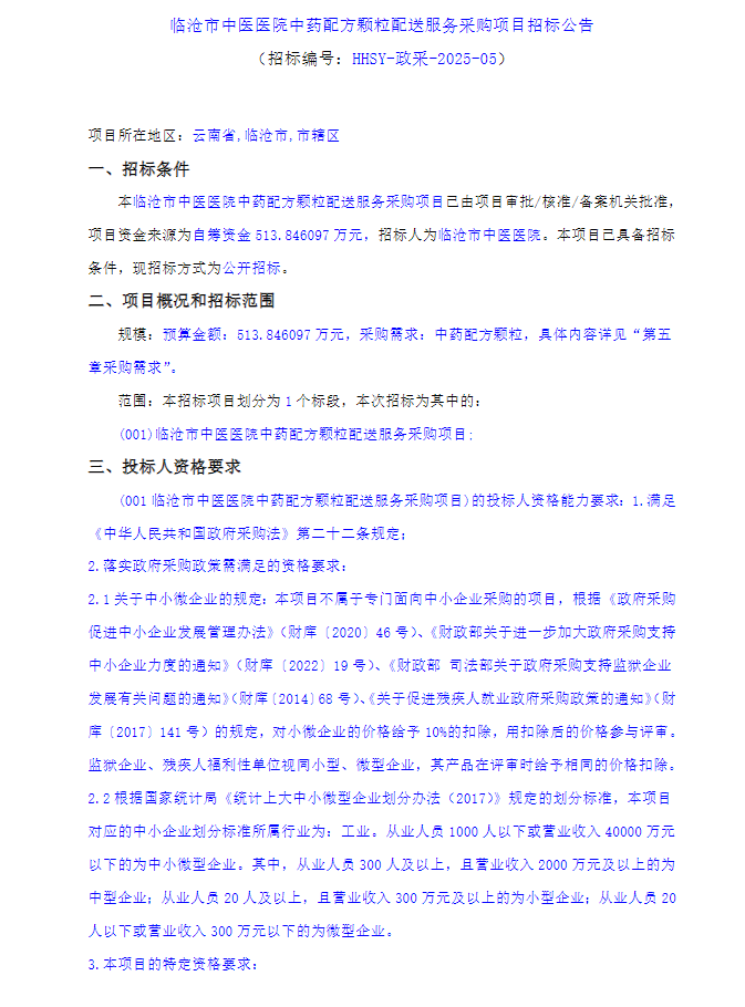 【临沧市中医医院】云南省临沧市中医医院中药配方颗粒配送服务采购项目招标公告