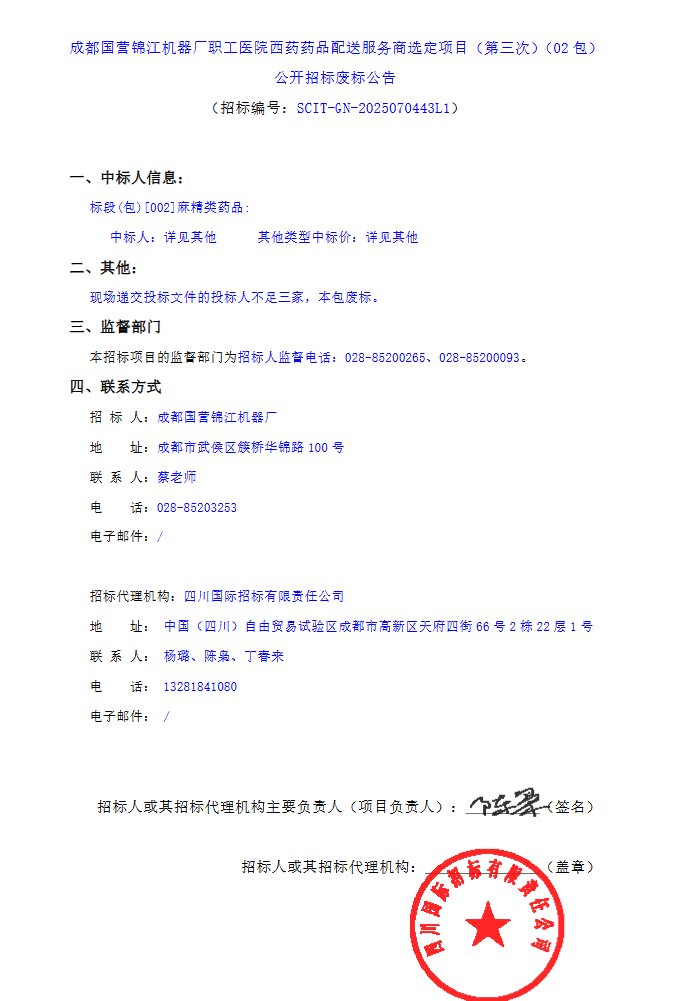 【成都国营锦江机器厂职工医院】四川省成都国营锦江机器厂职工医院西药药品配送服务商选定项目(第三次)(02包)公开招标废标公告