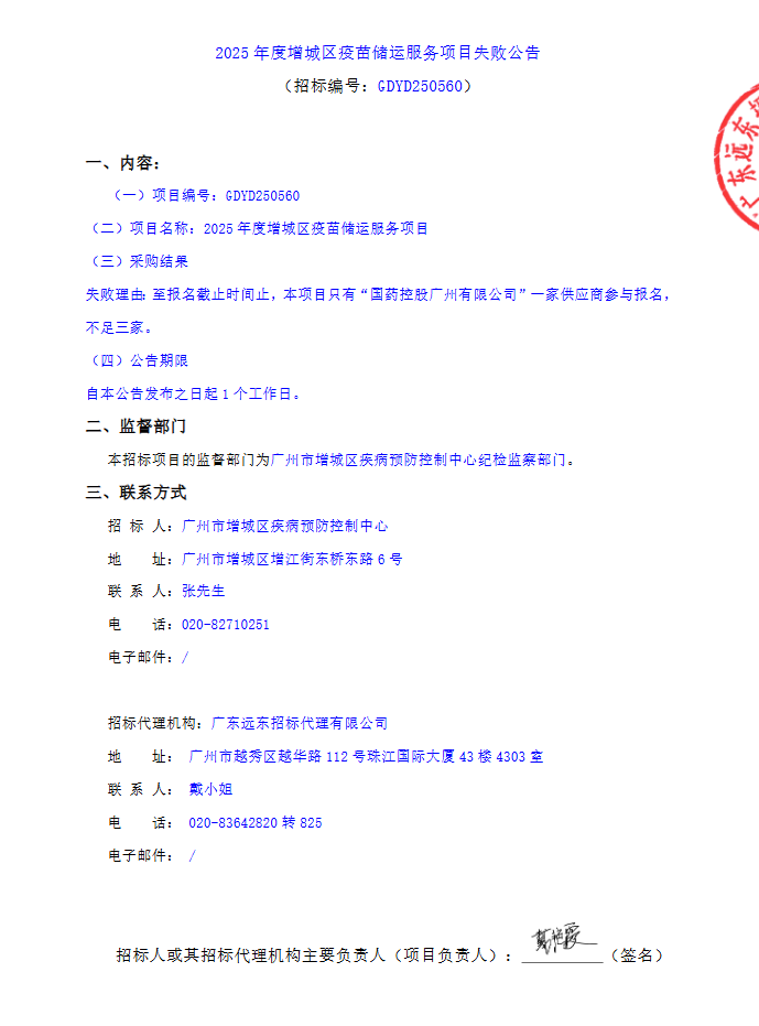 【广州市增城区疾病预防控制中心】广东省广州市2025年度增城区疫苗储运服务项目失败公告