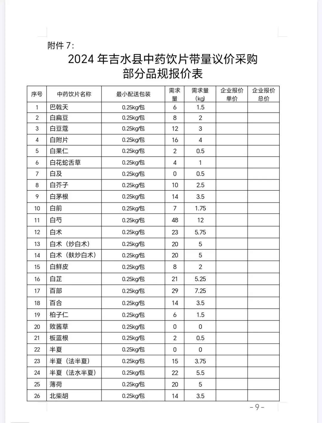 7.2024年吉水县乡镇卫生院中药饮片带量议价采购部分品规报价表