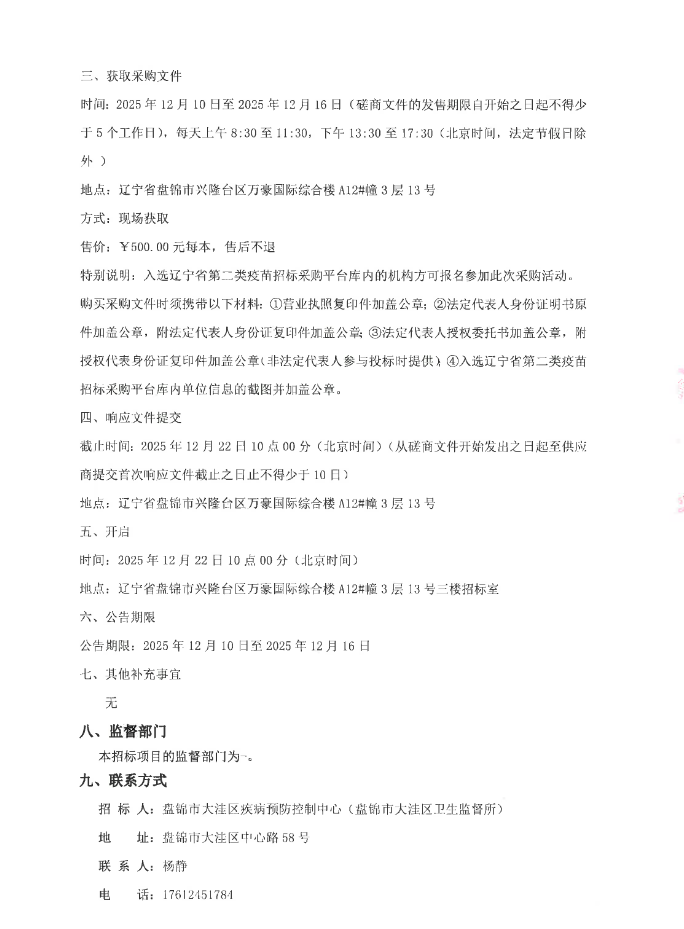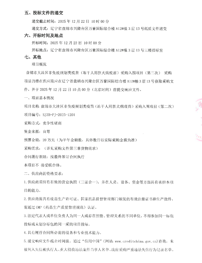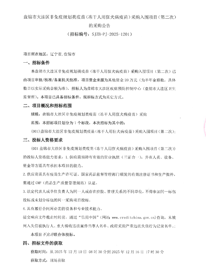 【盘锦市大洼区疾病预防控制中心】辽宁省盘锦市大洼区非免疫规划类疫苗(冻干人用狂犬病疫苗)采购入围项目(第二次)的采购公告