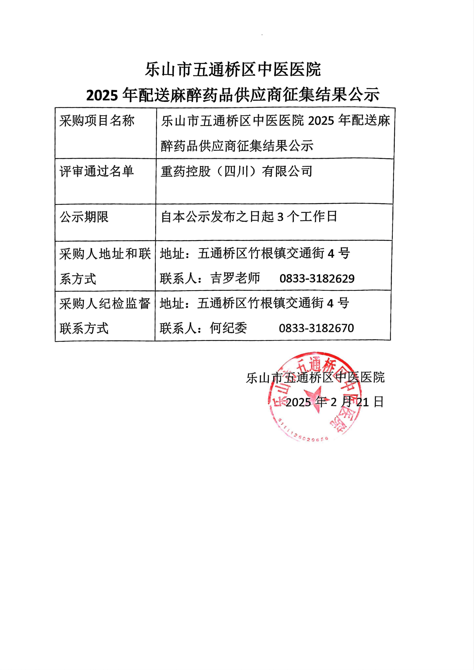 【乐山市五通桥区中医医院】四川省乐山市五通桥区中医医院2025年配送麻醉药品供应商征集结果公示
