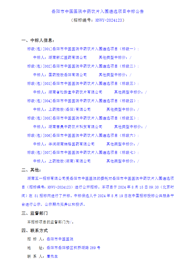 【岳阳市中医医院】湖南省岳阳市中医医院中药饮片入围遴选项目中标公告