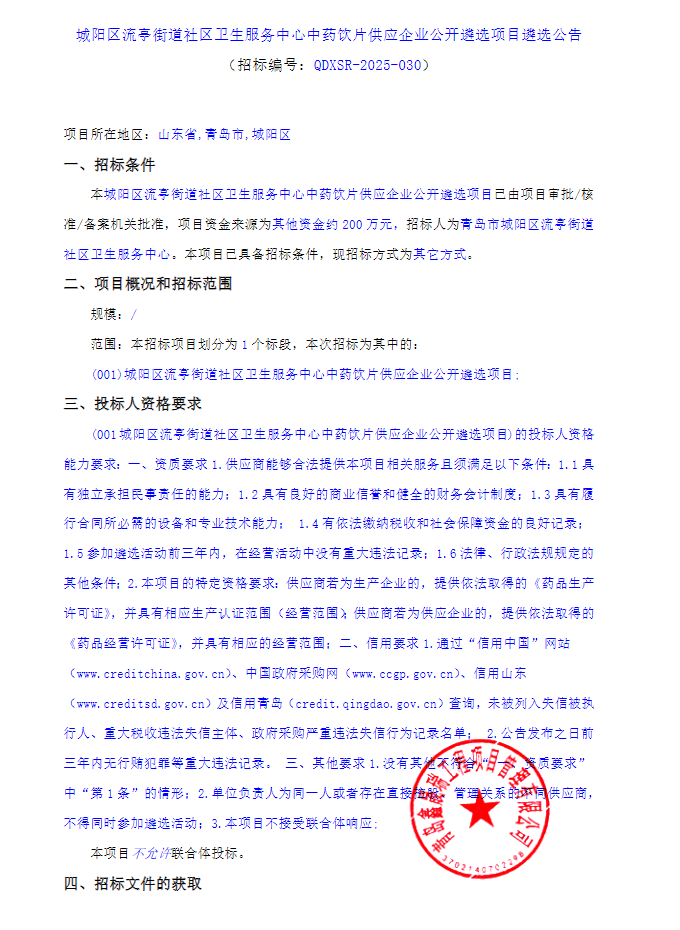 【青岛市城阳区流亭街道社区卫生服务中心】山东省青岛市城阳区流亭街道社区卫生服务中心中药饮片供应企业公开遴选项目遴选公告