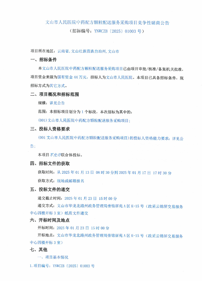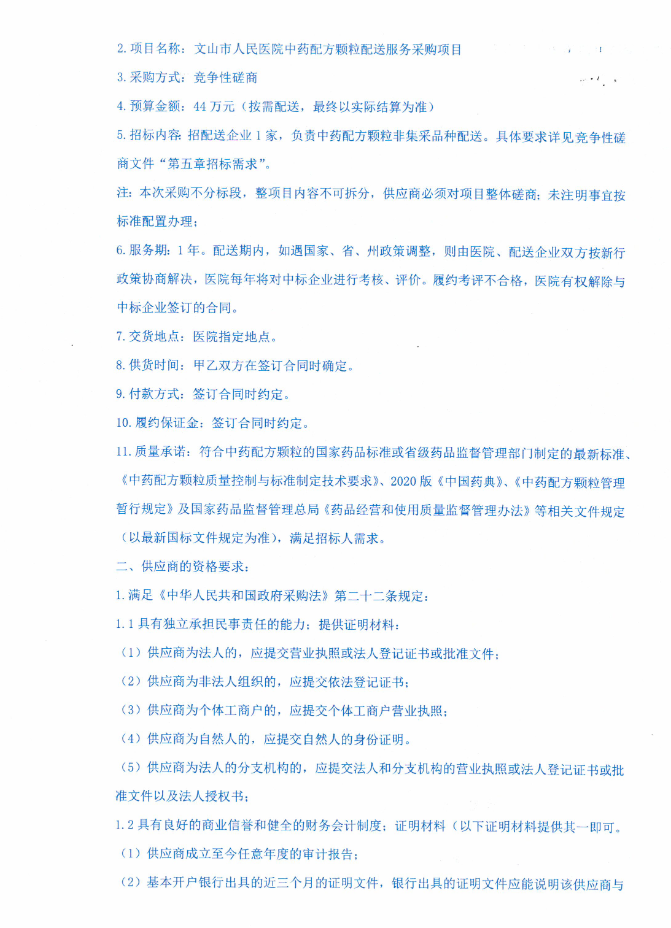 【文山市人民医院】云南省文山市人民医院中药配方颗粒配送服务采购项目竞争性磋商公告