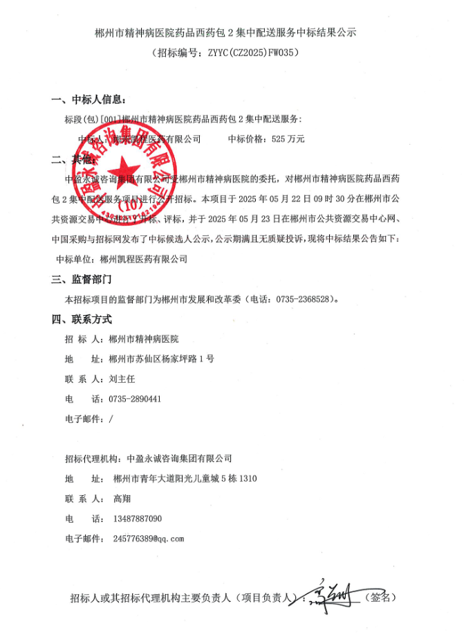 【郴州市精神病医院】湖南省郴州市精神病医院药品西药包2集中配送服务中标结果公示
