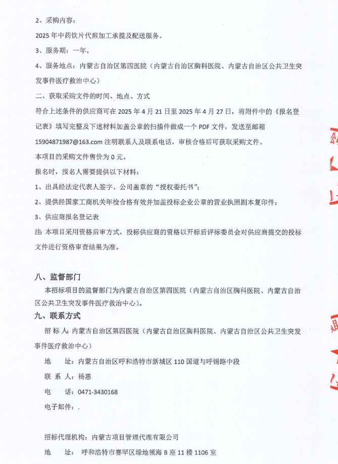 【内蒙古自治区第四医院】内蒙古自治区第四医院(内蒙古自治区胸科医院、内蒙古自治区公共卫生突发事件医疗救治中心)2025年中药饮片代煎加工承揽及配送项目招标公告