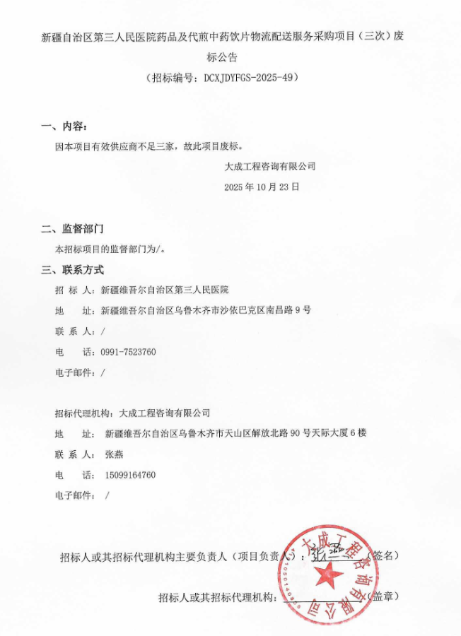 【新疆自治区第三人民医院】新疆自治区第三人民医院药品及代煎中药饮片物流配送服务采购项目(三次)废标公告