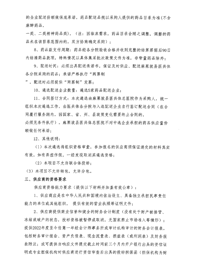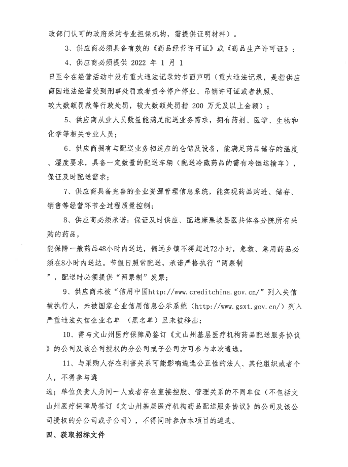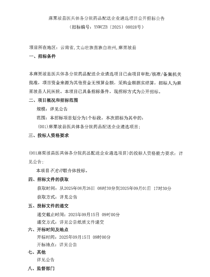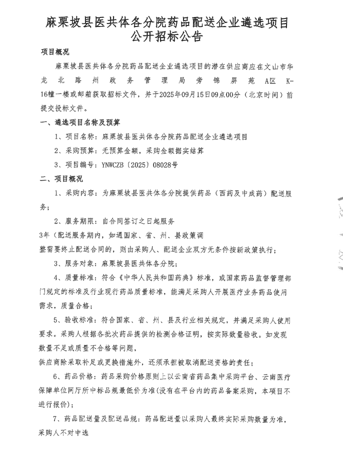 【文山壮族苗族自治州麻栗坡县人民医院】云南省文山壮族苗族自治州麻栗坡县医共体各分院药品配送企业遴选项目公开招标公告
