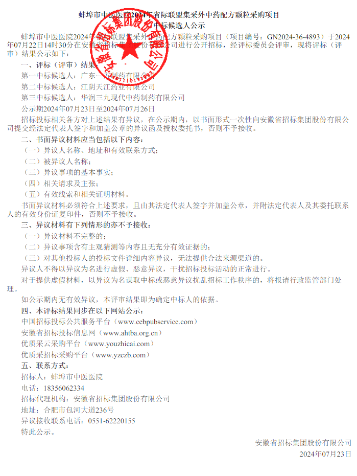【蚌埠市中医医院】安徽省蚌埠市中医医院2024年省际联盟集采外中药配方颗粒采购项目中标候选人公示