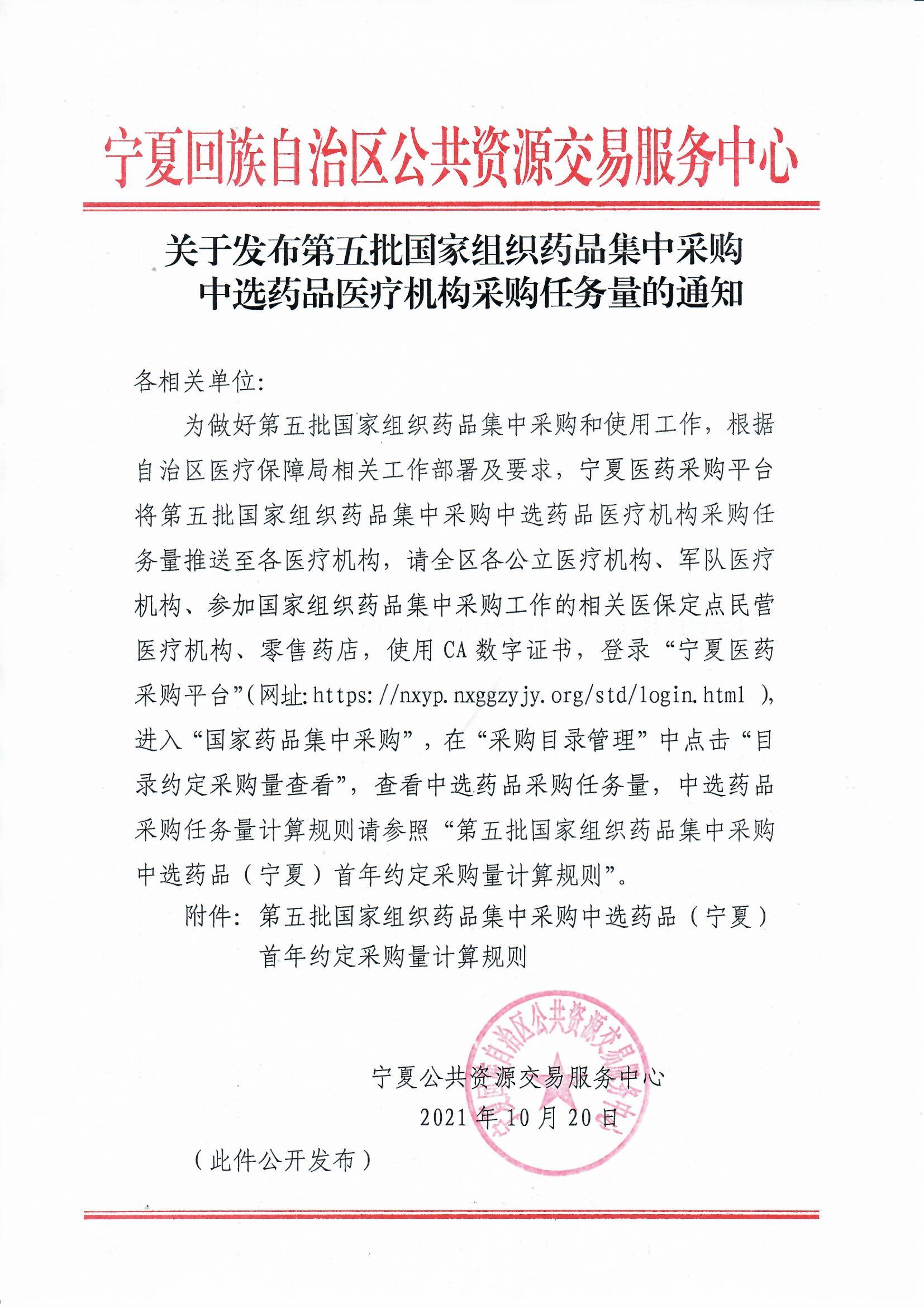 【宁夏】2021年宁夏自治区关于发布第五批国家组织药品集中采购中选药品医疗机构采购任务量的通知