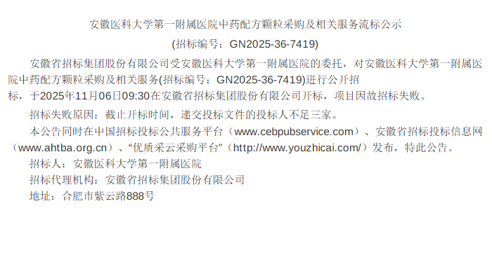 【安徽医科大学第一附属医院】安徽医科大学第一附属医院中药配方颗粒采购及相关服务流标公示(20251106)