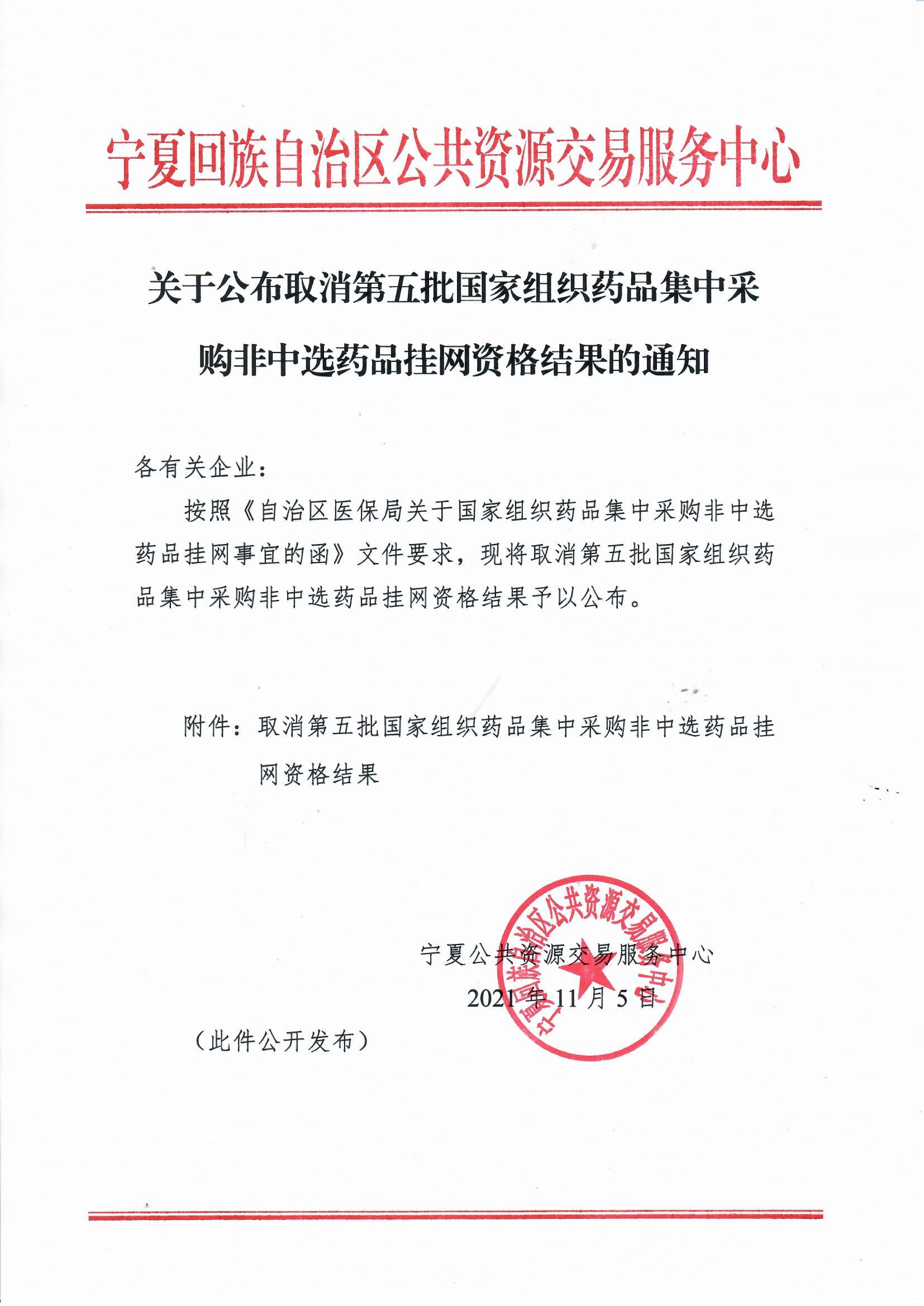 【宁夏】2021年宁夏自治区关于公布取消第五批国家组织药品集中采购非中选药品挂网资格结果的通知
