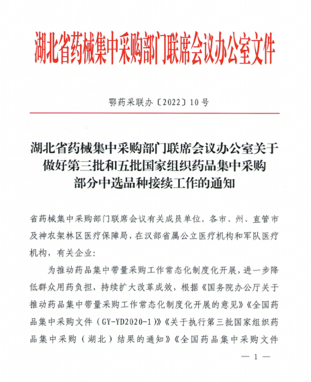 现将《湖北省药械集中采购部门联席会议办公室关于做好第三批和五批国家组织药品集中采购部分中选品种接续工作的通知》(鄂药采联办〔2022〕10号)转发给你们,请遵照执行。