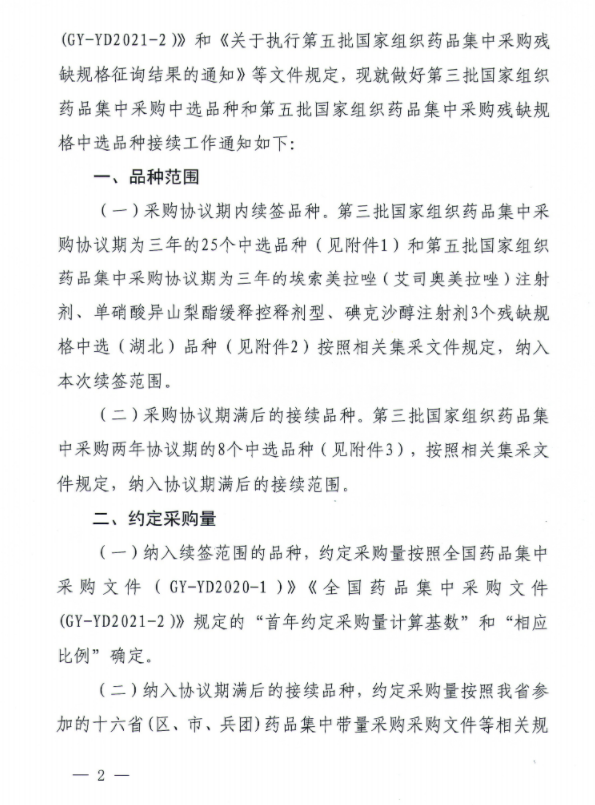 (一)采购协议期内续签品种。第三批国家组织药品集中采购协议期为三年的25个中选品种(见附件1)和第五批国家组织药品集中采购协议期为三年的埃索美拉唑(艾司奥美拉唑)注射剂、单硝酸异山梨酯缓释控释剂型、碘克沙醇注射剂3个残缺规格中选(湖北)品种(见附件2)按照相关集采文件规定,纳入本次续签范围。