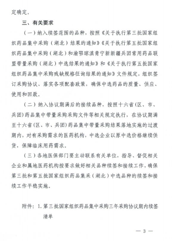 (三)各地医保部门要主动联系有关单位,指导、督促相关企业和属地医药机构按要求做好相关品种续签和接续工作,确保第三批和第五批国家组织药品集采(湖北)中选品种的续签和接续工作平稳实施。