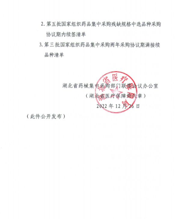 (一)纳入续签范围的品种,按照《关于执行第三批国家组织药品集中采购(湖北)结果的通知》《关于执行第五批国家组织药品集中采购(湖北)和渝鄂琼滇青宁新新疆兵团常用药品联盟带量采购(湖北)中选结果的通知》和《关于执行第五批国家组织药品集中采购残缺规格征询结果的通知》文件规定,组织签订采购协议、落实各项配套政策,确保中选药品的质量、供应、使用和回款。