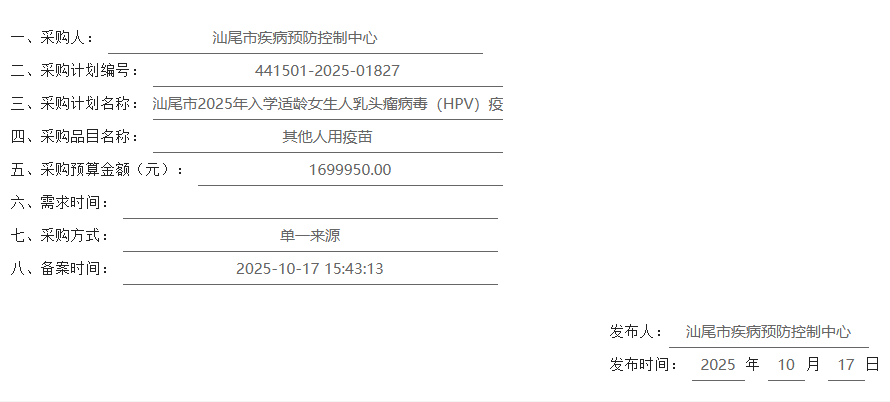 【汕尾市疾病预防控制中心】广东省汕尾市2025年入学适龄女生人乳头瘤病毒(HPV)疫苗采购项目