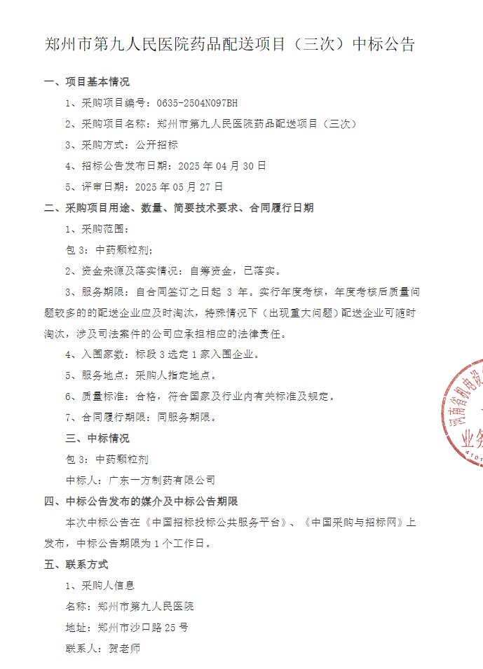 【郑州市第九人民医院】河南省郑州市第九人民医院药品配送项目(三次)中标公告