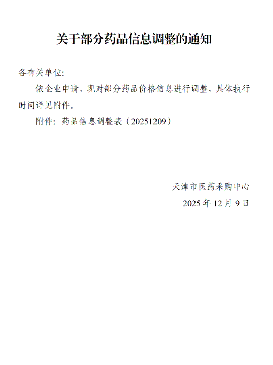 【天津】天津市关于部分药品信息调整的通知(20251209)
