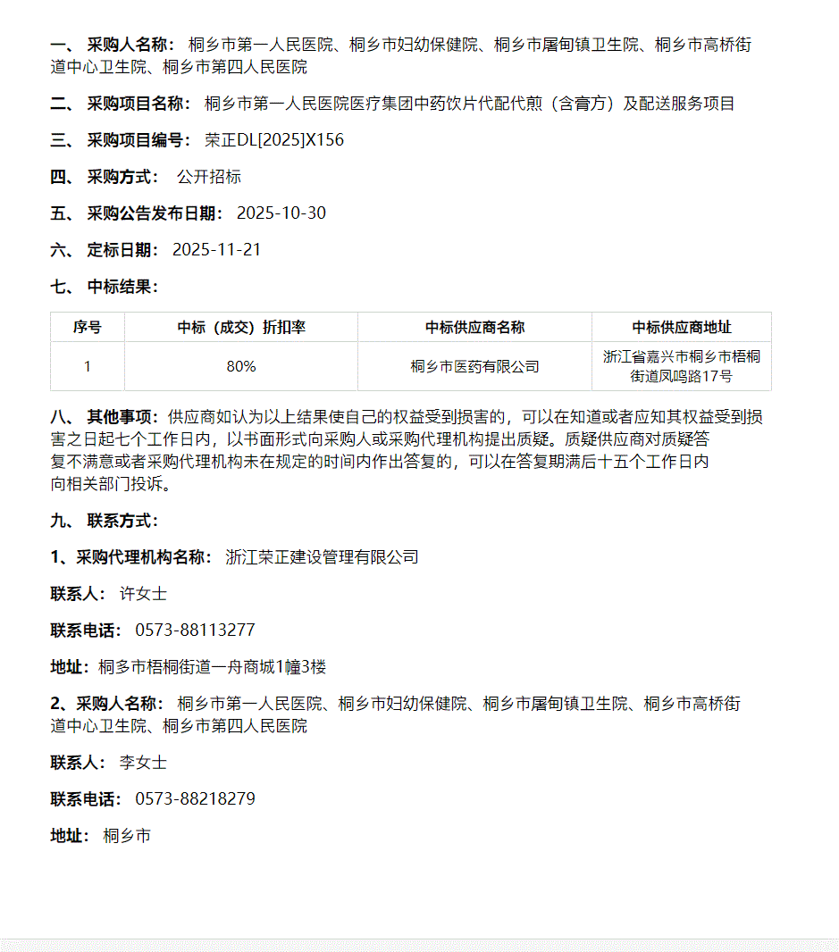 【桐乡市第一人民医院】浙江荣正建设管理有限公司关于桐乡市第一人民医院医疗集团中药饮片代配代煎(含膏方)及配送服务项目的中标(成交)结果公告(非政府采购)