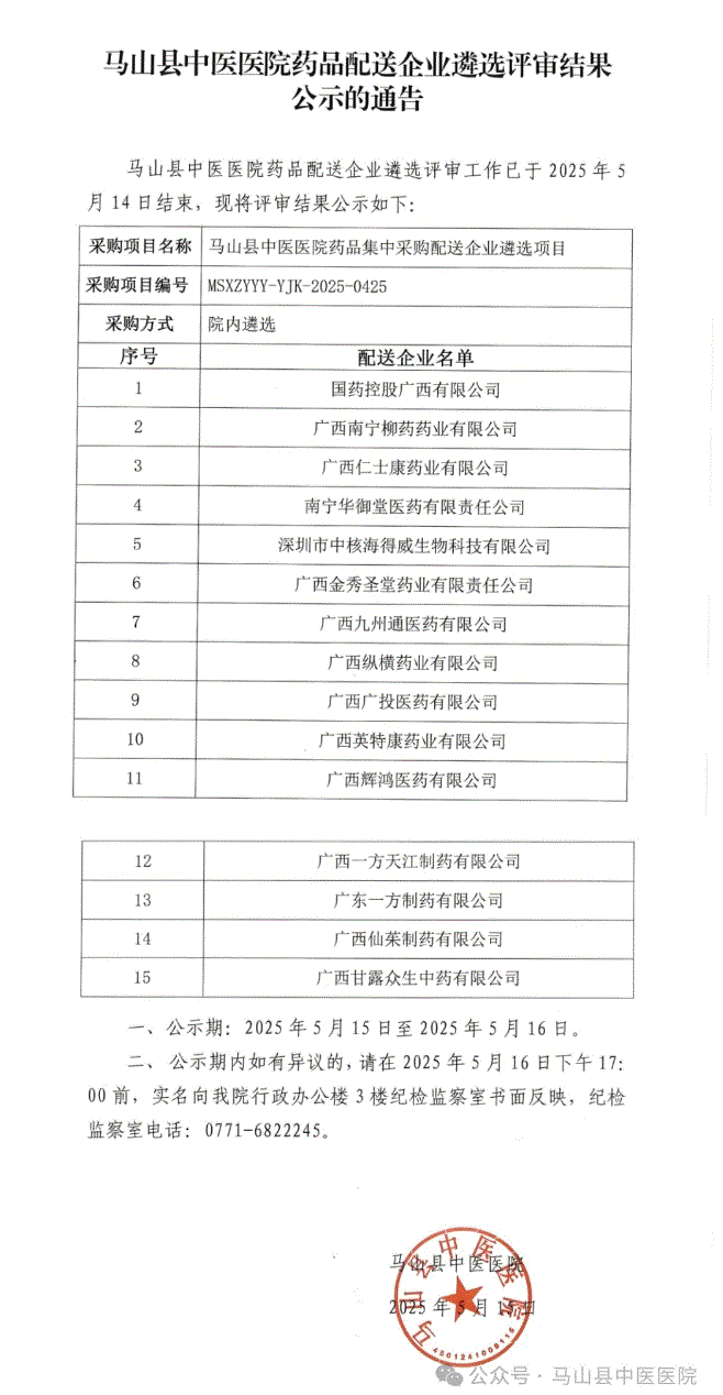 【南宁市马山县中医医院】广西壮族自治区南宁市马山县中医医院药品配送企业遴选评审结果公示的通告