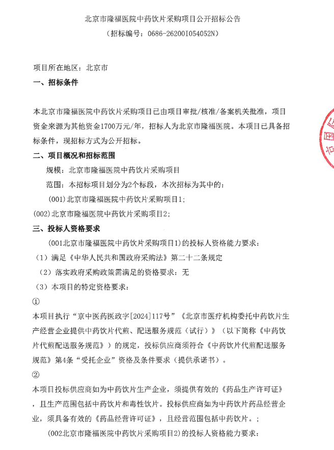 【北京市隆福医院】北京市隆福医院中药饮片采购项目公开招标公告