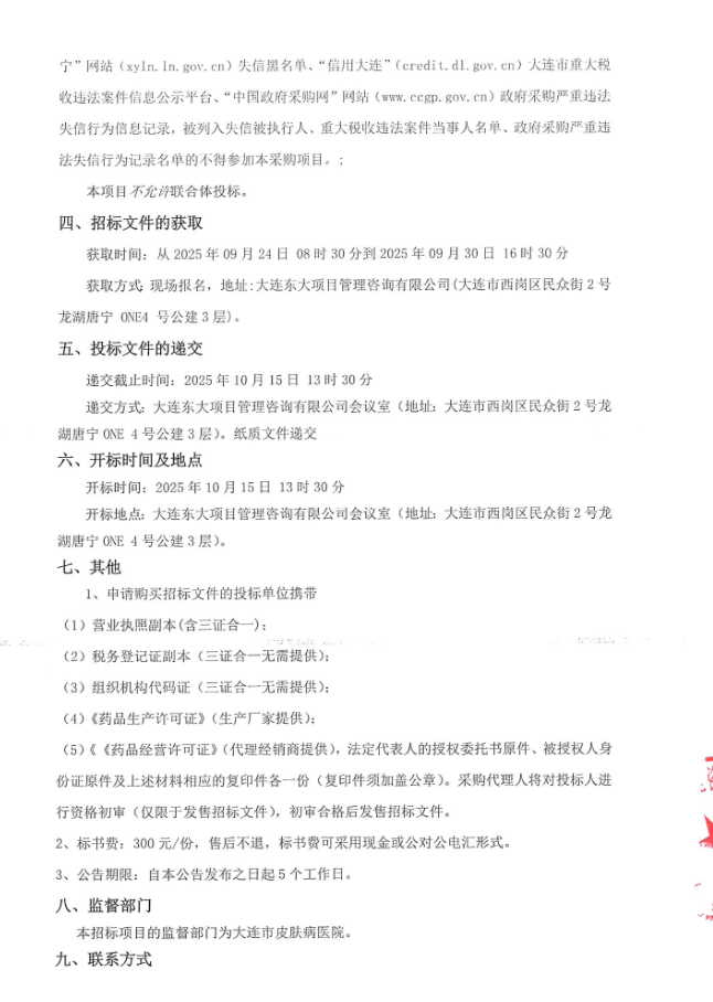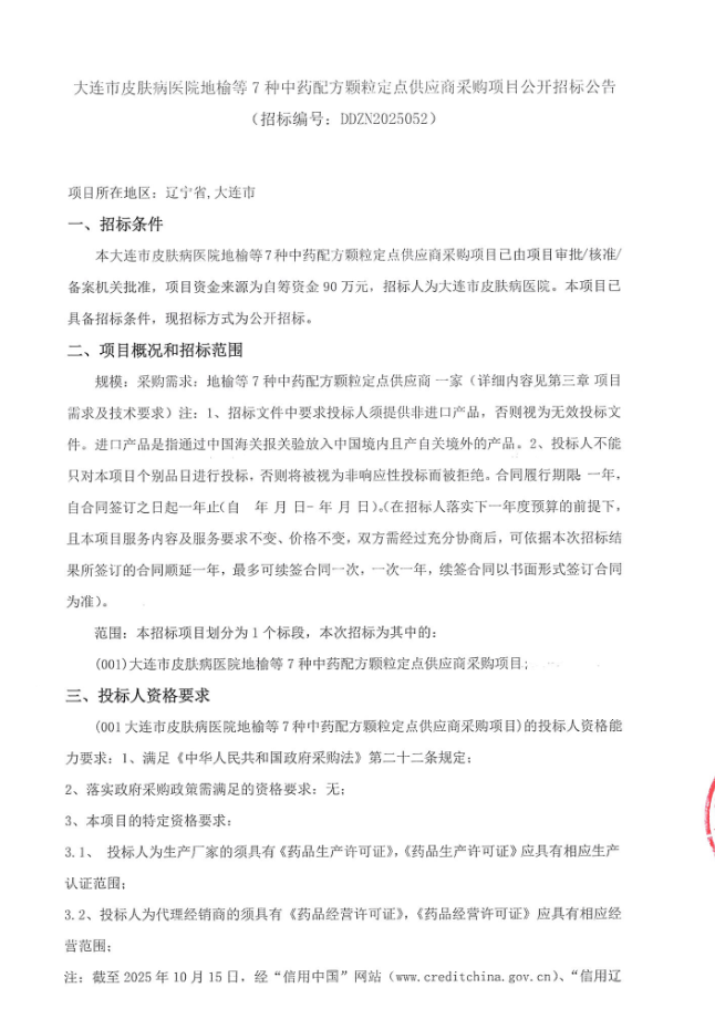 【大连市皮肤病医院】辽宁省大连市皮肤病医院地榆等7种中药配方颗粒定点供应商采购项目公开招标公告