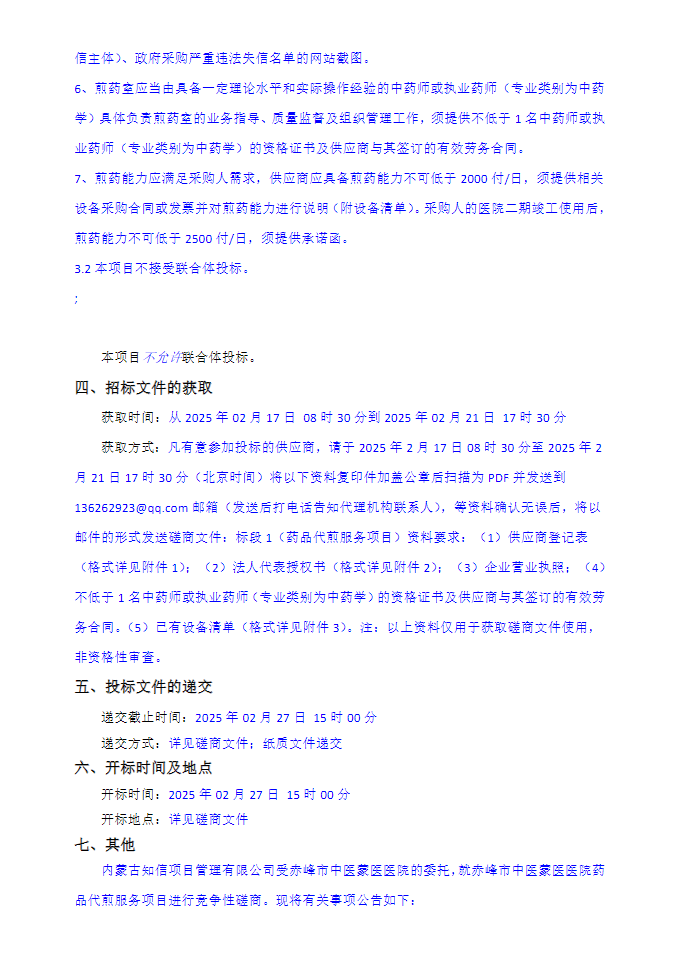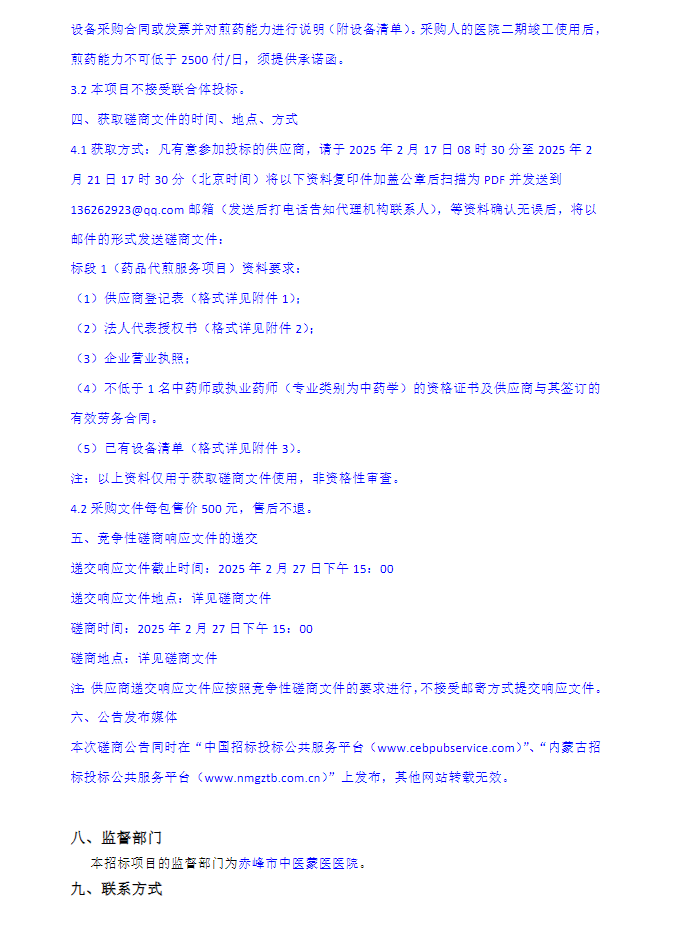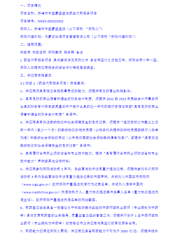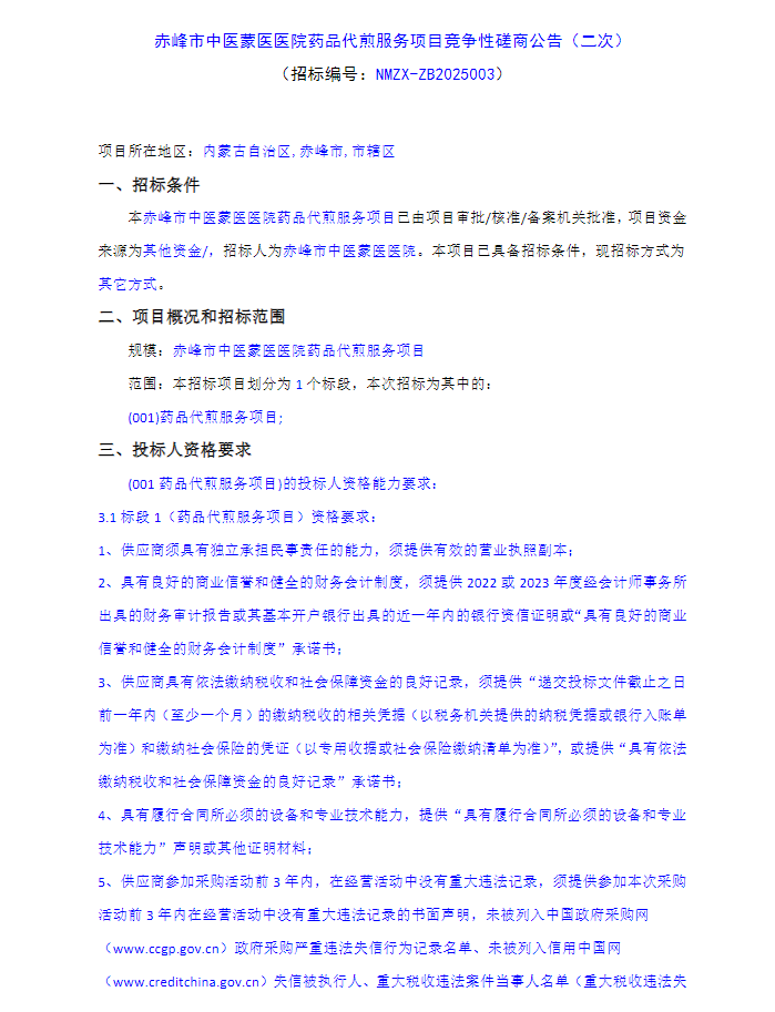 【赤峰市中医蒙医医院】内蒙古自治区赤峰市中医蒙医医院药品代煎服务项目竞争性磋商公告(二次)