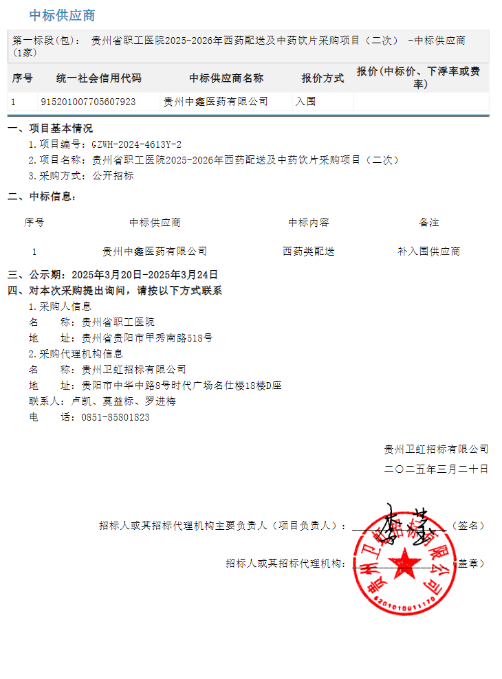 【贵州省职工医院】贵州省职工医院2025-2026年西药配送及中药饮片采购项目(二次)中标公告