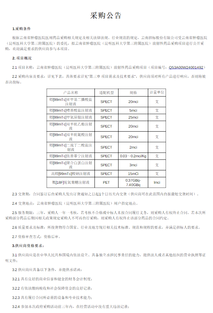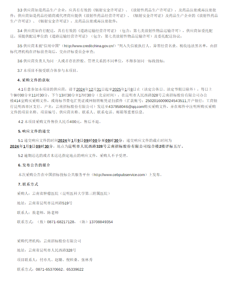 【云南省肿瘤医院】云南省肿瘤医院(昆明医科大学第三附属医院)放射性药品采购项目竞争性磋商公告
