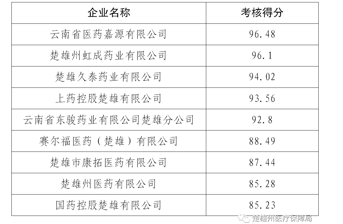 【楚雄】2021年7月至12月基层医疗卫生机构药品配送企业考核评分结果公示