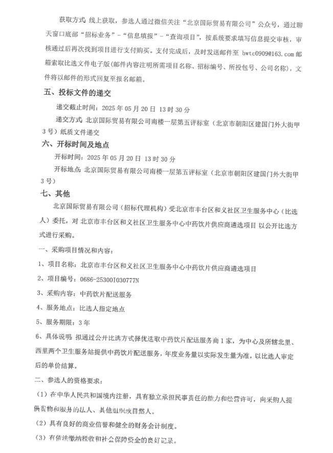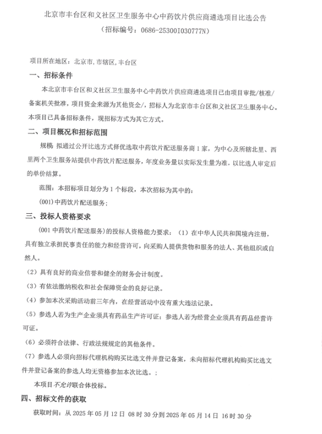 【北京市丰台区和义社区卫生服务中心】北京市丰台区和义社区卫生服务中心中药饮片供应商遴选项目比选公告
