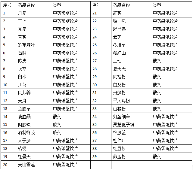 本项目要求所有报名单位提供下列39种中药破壁、袋泡饮片样本(每种三小包)和各种能证明药品质量的批文、证书。需提供的39种中药破壁饮片具体如下表: