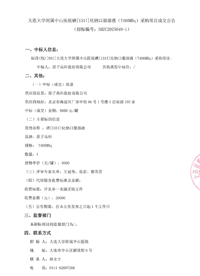 【大连大学附属中山医院】辽宁省大连大学附属中山医院碘〔131I〕化钠口服溶液(7400MBq)采购项目成交公告