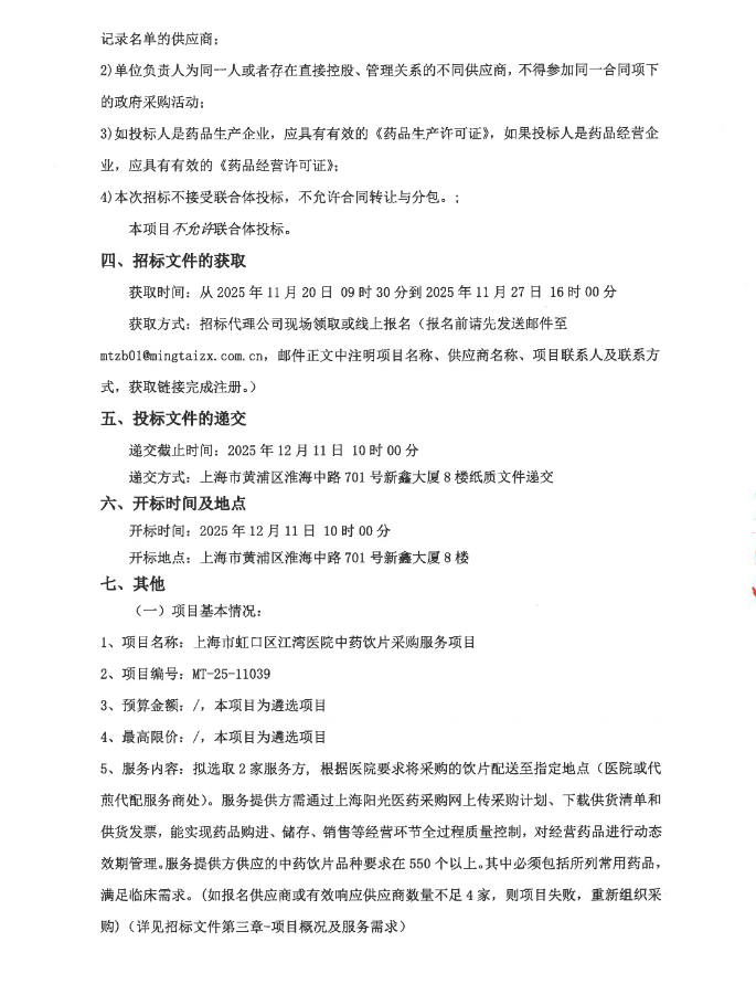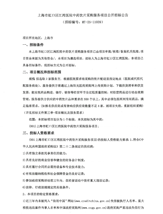 【上海市虹口区江湾医院】上海市虹口区江湾医院中药饮片采购服务项目公开招标公告