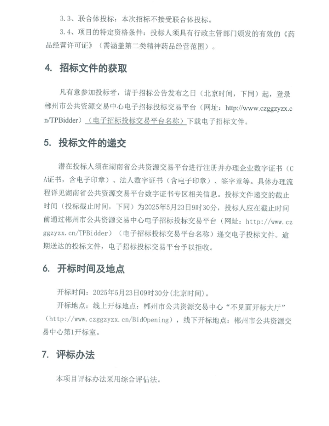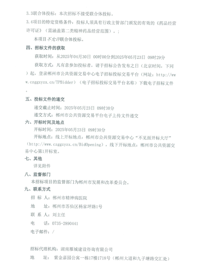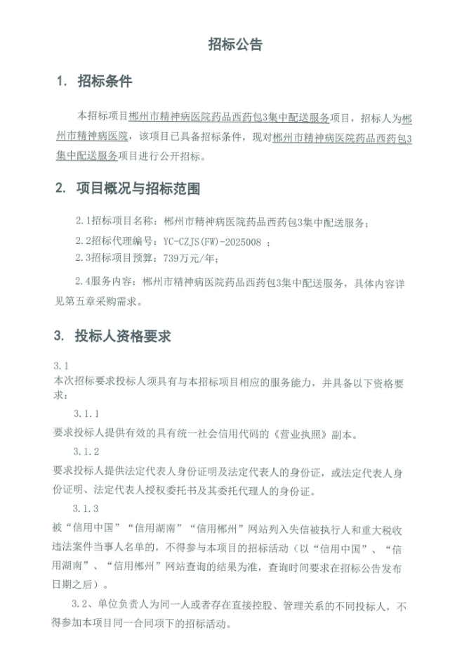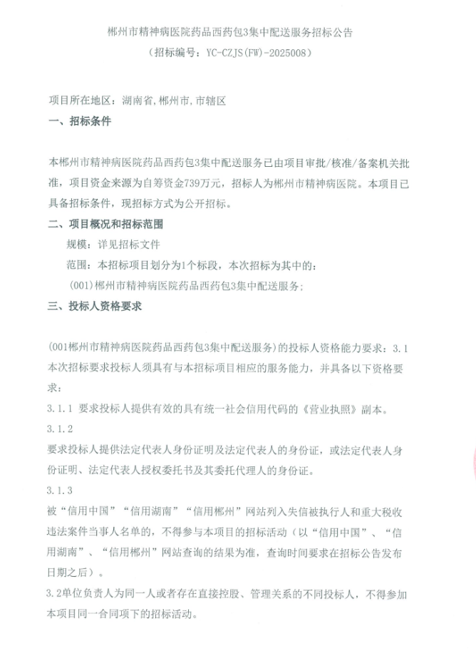 【郴州市精神病医院】湖南省郴州市精神病医院药品西药包3集中配送服务招标公告