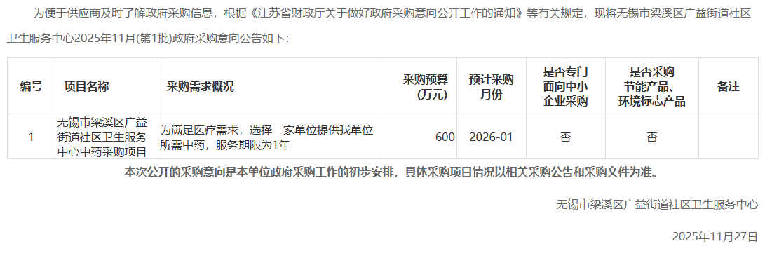 【无锡市梁溪区广益街道社区卫生服务中心】江苏省无锡市梁溪区广益街道社区卫生服务中心2025年11月(第1批)政府采购意向公告