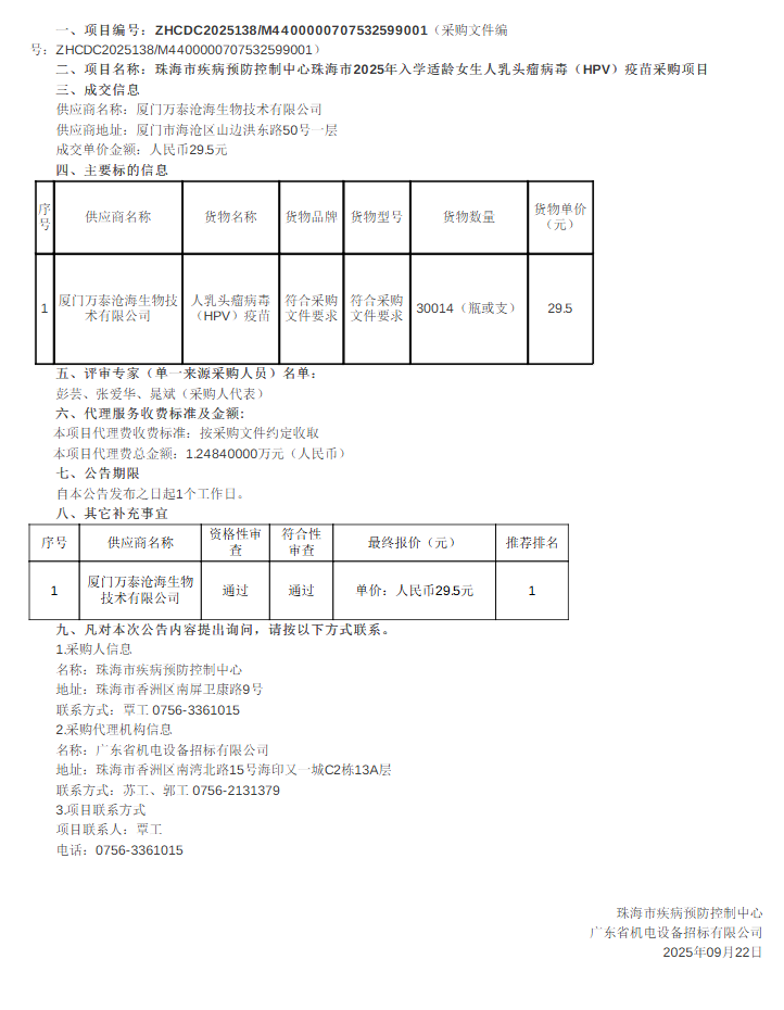 【珠海市疾病预防控制中心】广东省珠海市疾病预防控制中心珠海市2025年入学适龄女生人乳头瘤病毒(HPV)疫苗采购项目成交公告