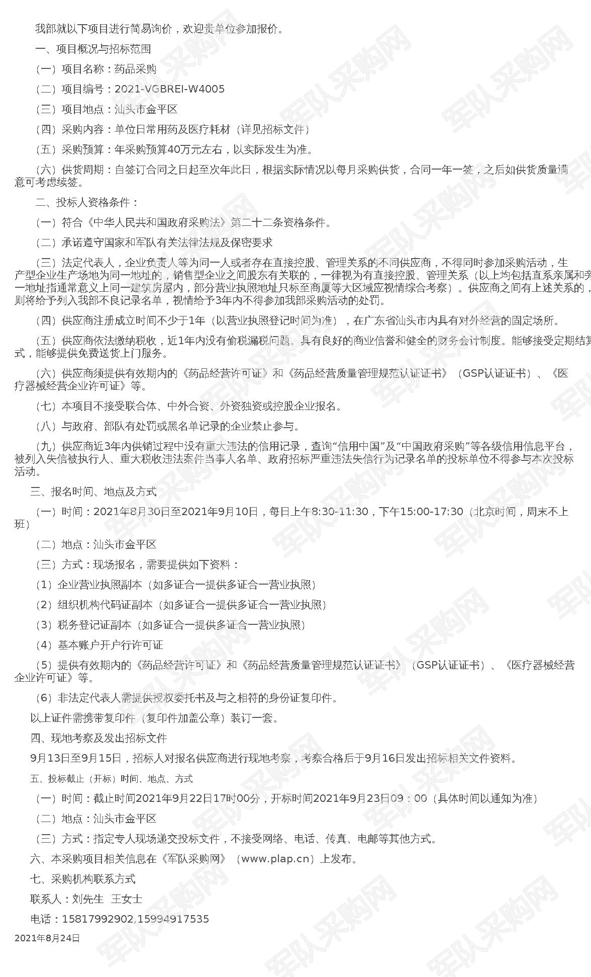2021年军队汕头某部药品及医用耗材采购项目(2021-VGBREI-W4005)