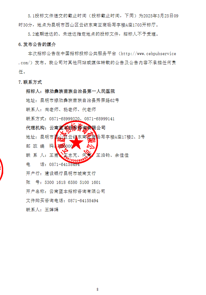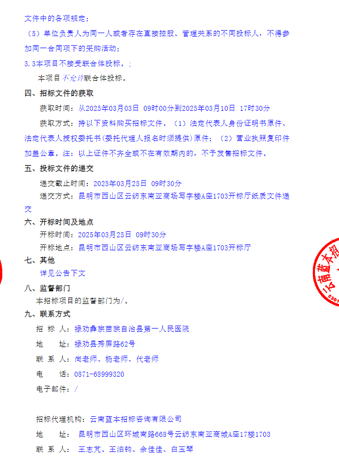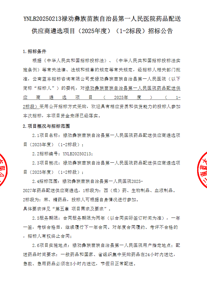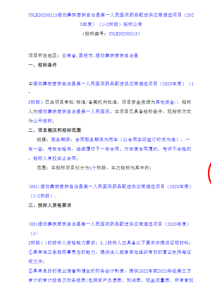 【昆明市劝彝族苗族自治县第一人民医院】云南省昆明市劝彝族苗族自治县第一人民医院药品配送供应商遴选项目(2025年度)(1-2标段)招标公告