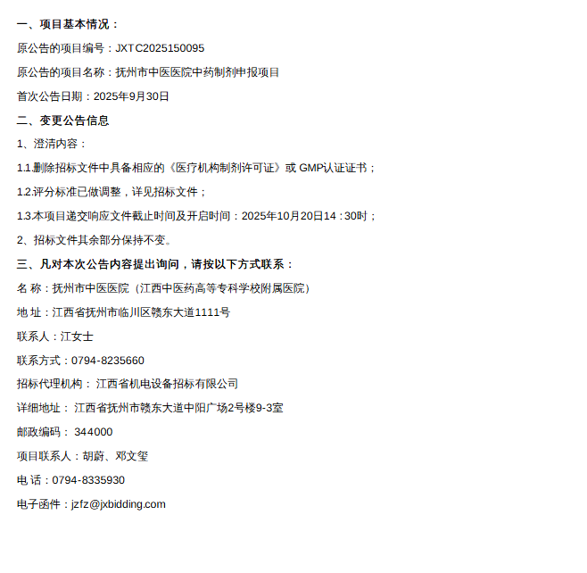 【抚州市中医医院】江西省抚州市中医医院中药制剂申报项目的澄清公告