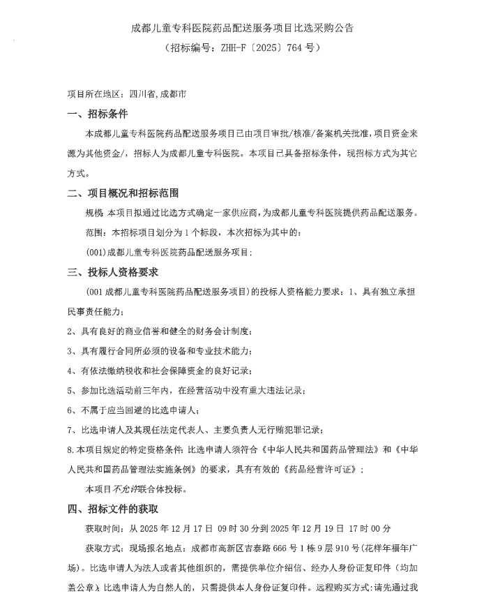 【成都儿童专科医院】四川省成都儿童专科医院药品配送服务项目比选采购公告
