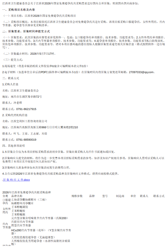 【江西省卫生健康委员会】江西省卫生健康委员会2026年国家免费避孕药具采购项目采购需求征集公告