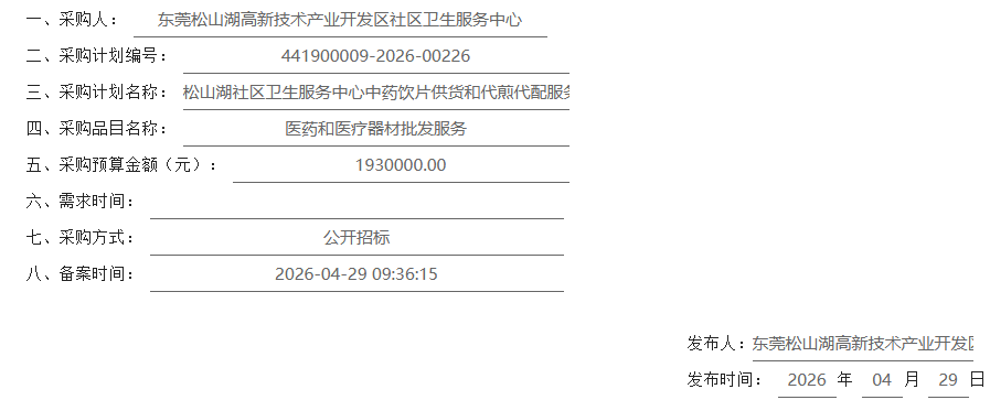【东莞市东湾市松山湖社区卫生服务中心】广东省东湾市松山湖社区卫生服务中心中药饮片供货和代煎代配服务采购项目
