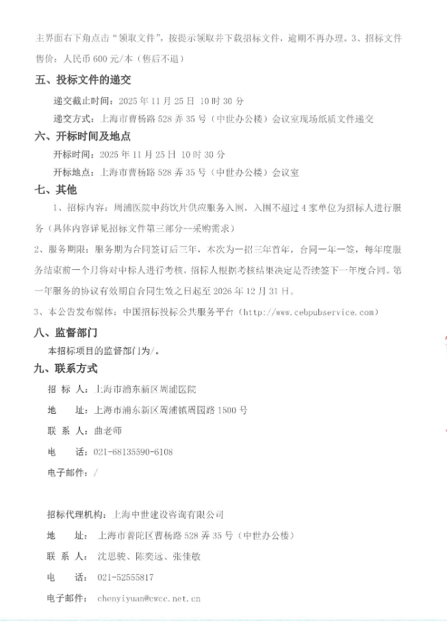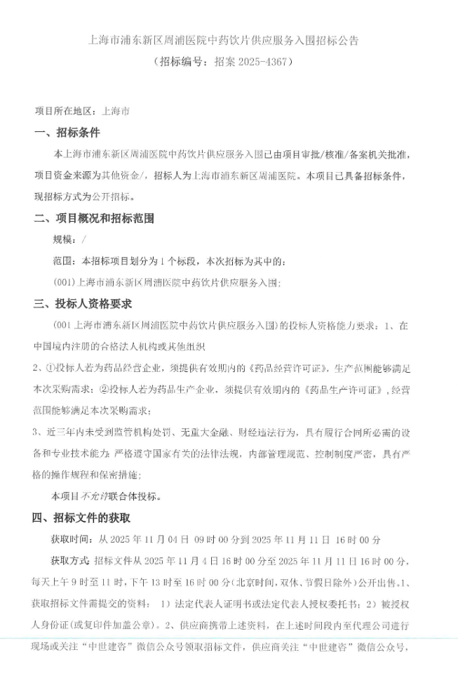 【上海市浦东新区周浦医院】上海市浦东新区周浦医院中药饮片供应服务入围招标公告