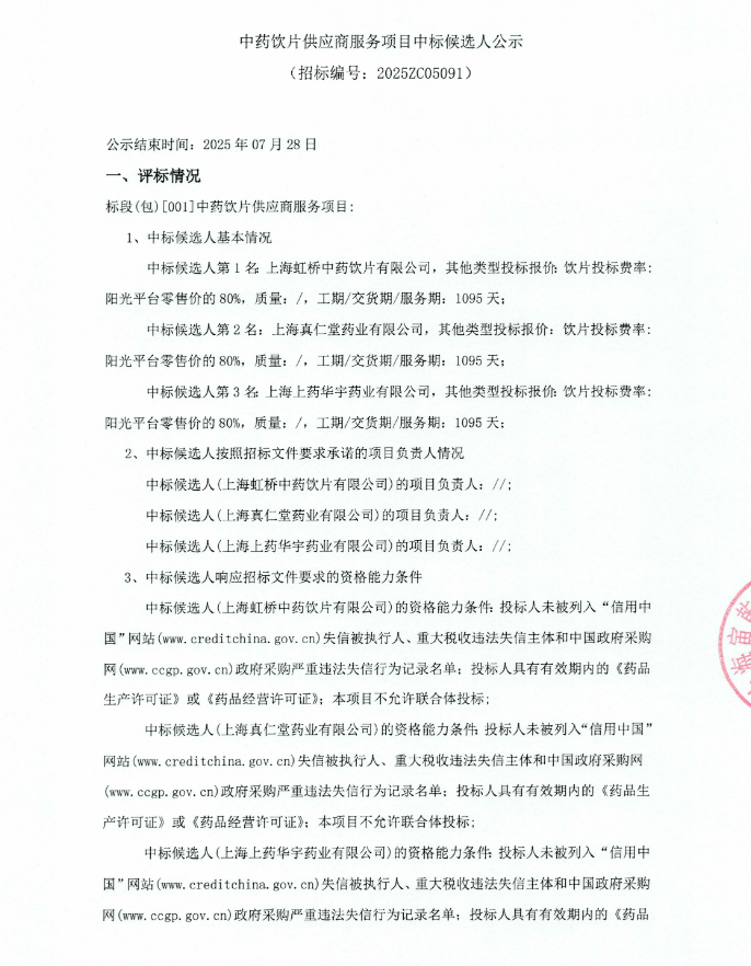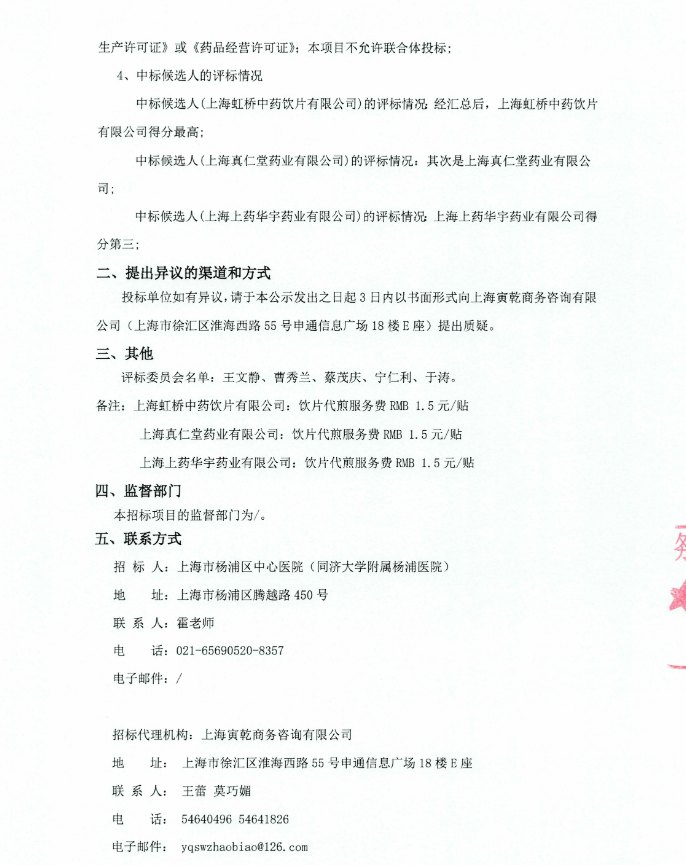【上海市杨浦区中心医院】上海市杨浦区中心医院中药饮片供应商服务项目中标候选人公示